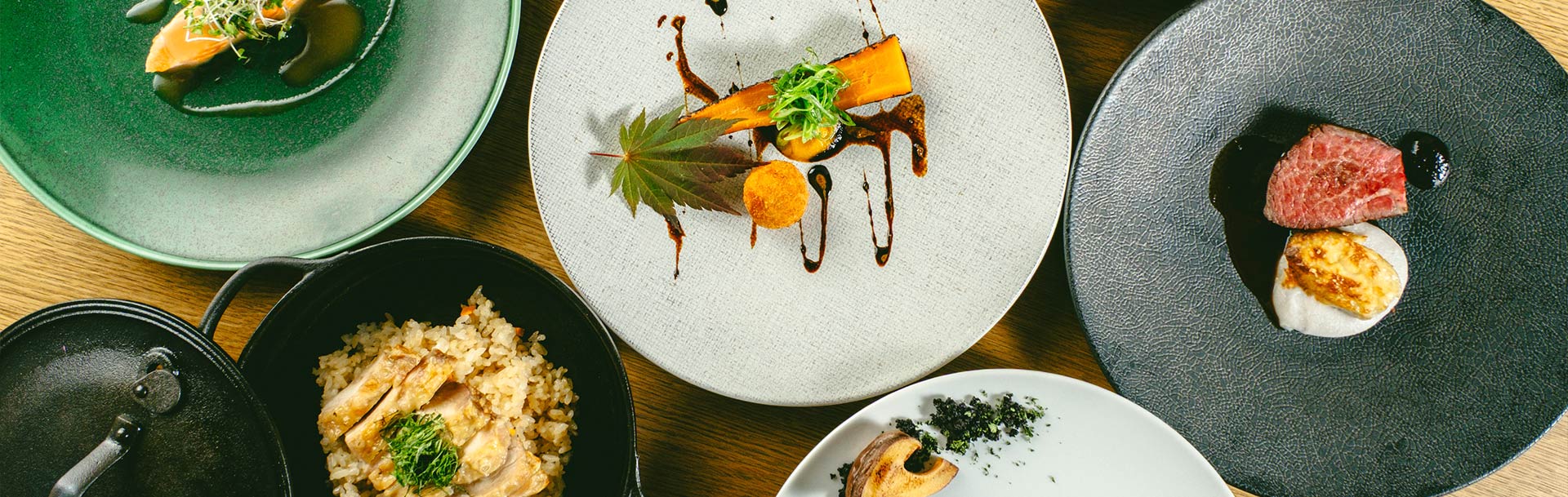 「四季折々の日本の食文化」と「繊細な技法によるフランスの料理文化」が融合した独自の調理スタイルで、季節の味覚・彩りを表現するとともに、味噌や醤油など「日本特有の食材・調味料」を使用し、味にも見た目にもご満足いただけるよう、丹念に仕上げております。