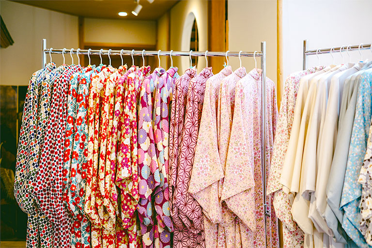 チェックインのあとは、お好きな着物をお選びください。女性用・男性用どちらも取り揃えております。