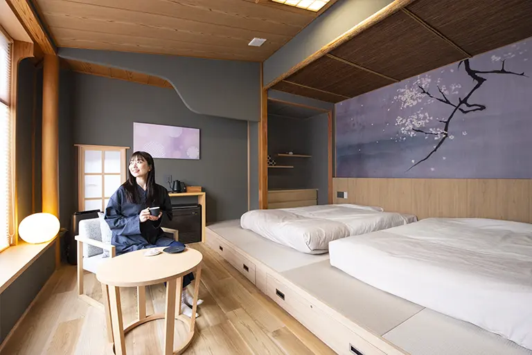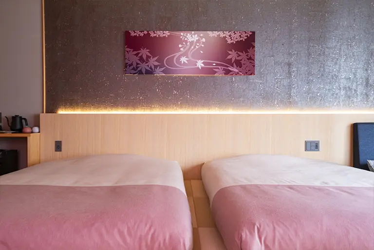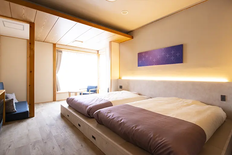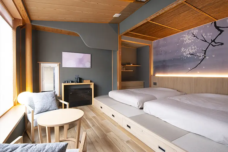 本旅館客房結合了日本古典的「色彩語言」與和服文樣,並以栗駒山麓和祭畤山的自然景觀及四季為主題。