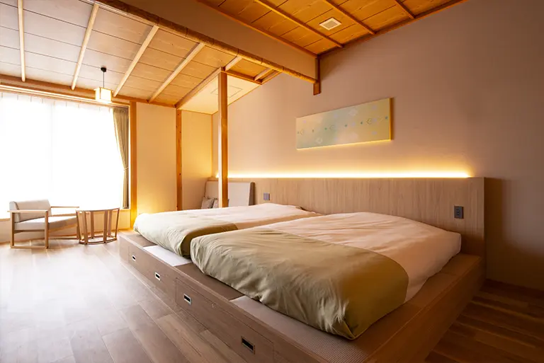 在溫泉「Kamikura」,您可享受如身臨美麗自然的氛圍,感受在每個季節都有不同風情的客房。